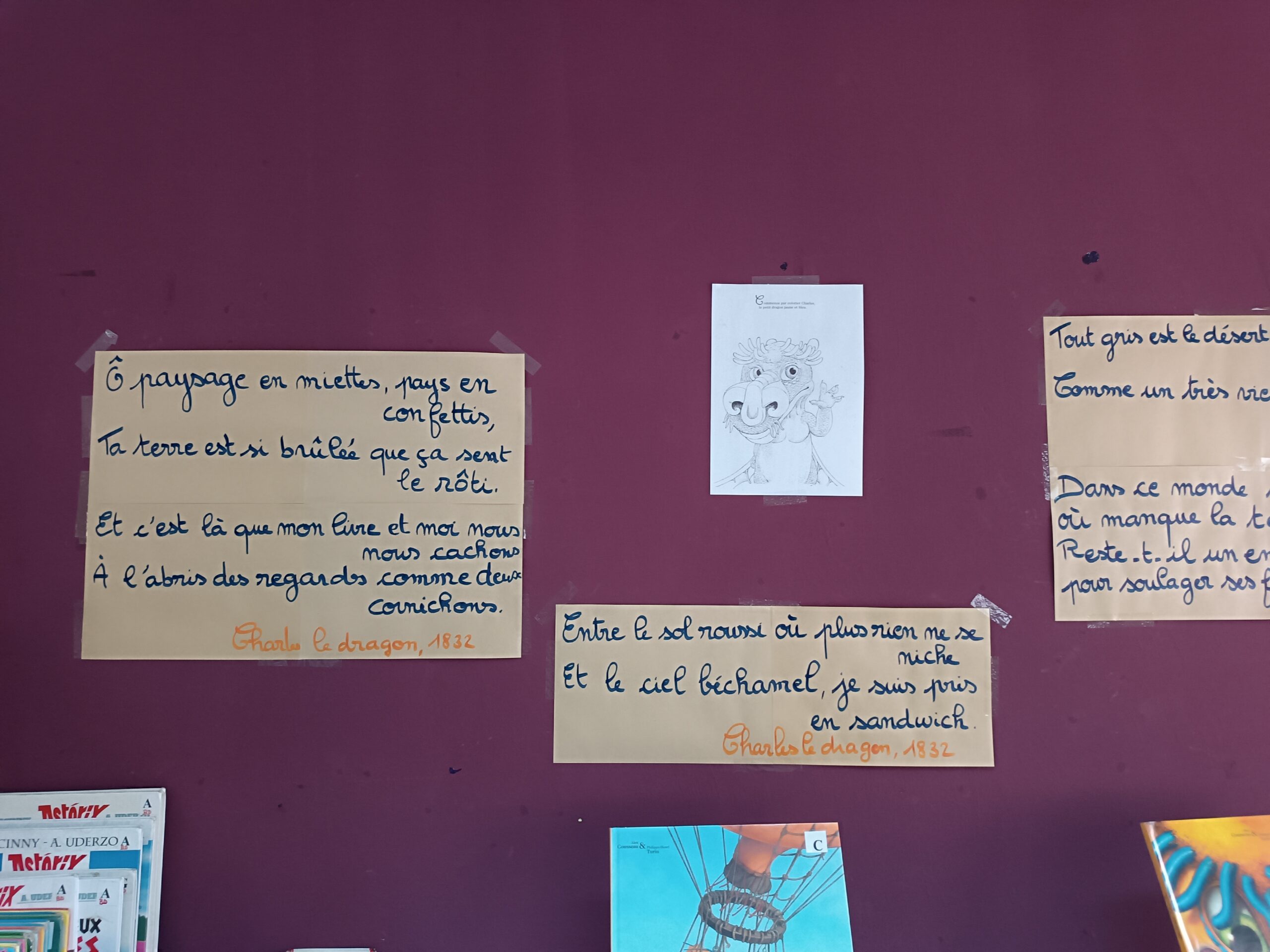 Écriture : avec « Charles le dragon » d’Alex Cousseau. Après l’écoute du texte et l’analyse de ses poèmes, les CM2 se lancent dans la rédaction de leurs propres poésies, à la manière de Charles :