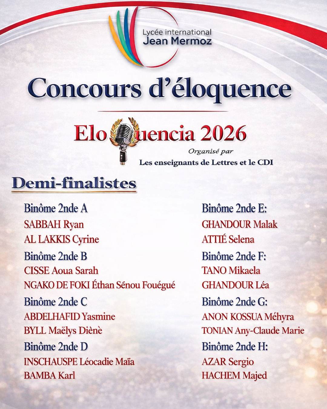 À l’issue des phases de présélection qui se sont déroulées en décembre 2025, 08 binômes ont été retenus pour participer à la demi-finale. Chaque classe de seconde est représentée par un binôme. Cette demi-finale est prévue se tenir le jeudi 12 février 2026.