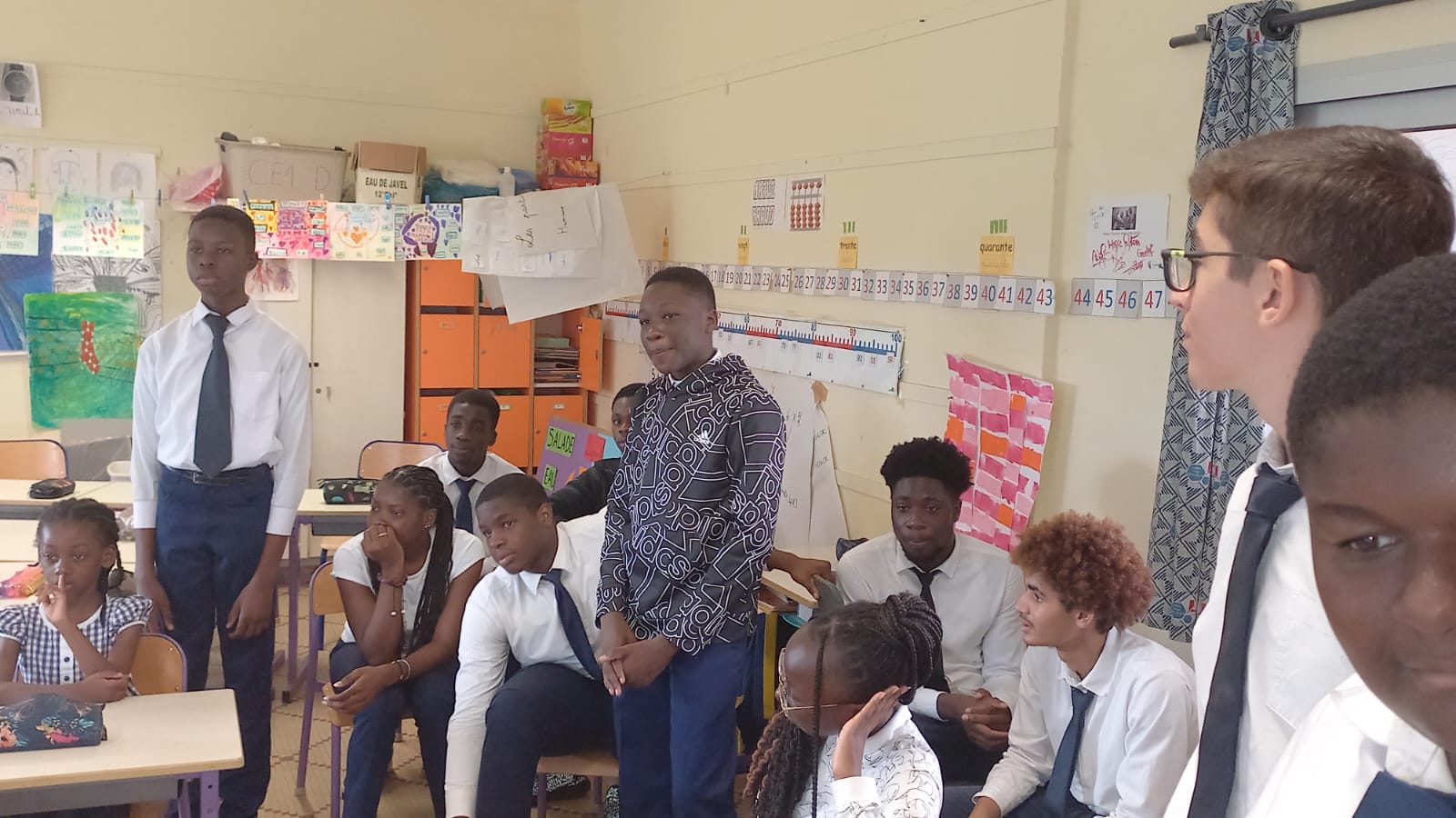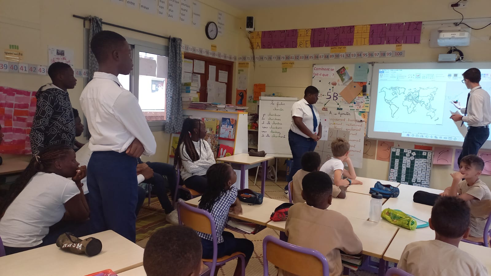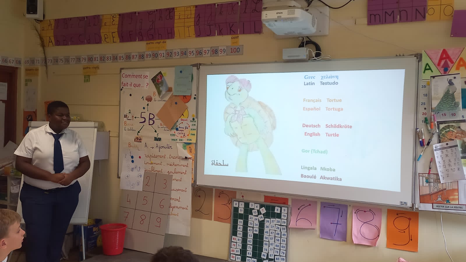 Ce mardi 23 mai, les élèves latinistes & hellénistes de la 2nde F se sont rendus dans la classe de CE1 de Mme Corvellec – Merendet afin de leur présenter un projet autour des familles linguistiques du monde entier. Un projet pensé sous la forme d’un album en images -une dizaine d’animaux, de l’éléphant à l’araignée-, pour sensibiliser les plus petits à l’histoire des mots dans différentes cultures. La séance a été menée par les lycéens dans un bel esprit de partage. Un succès, grâce à l’enthousiasme et l’active participation des plus petits qui ont su faire vivre et enrichir l’album Mermozoo !
